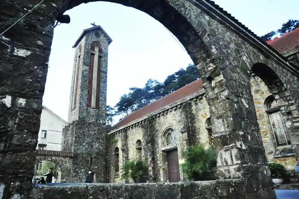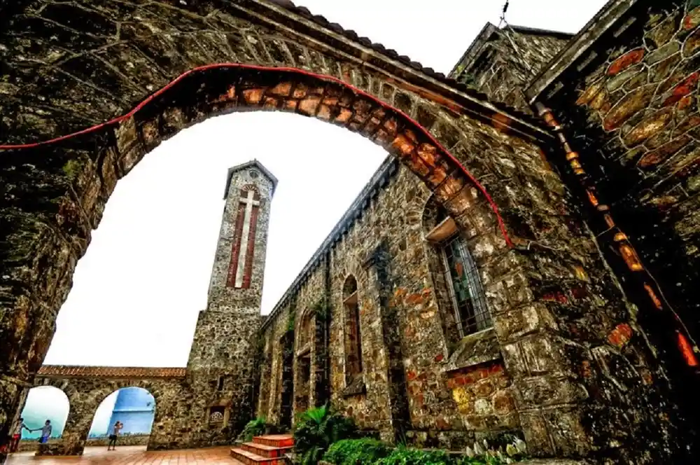 Nhà thờ được khởi dựng từ năm 1906, lúc đầu chỉ là ngôi nhà sàn lợp lá, mãi đến năm 1937 mới được xây dựng lại bằng đá theo mô hình kiến trúc Gothic. Đây là một trong bốn ngôi nhà thờ đá nổi tiếng ở Việt Nam, cùng với nhà thớ đá Phát Diệm (Ninh Bình), nhà thờ đá Sa Pa (Lào Cai) và nhà thờ đá Nha Trang (Khánh Hòa). Trải qua nhiều năm tháng, công trình này vẫn giữ nguyên sức sống và vẻ đẹp ấn tượng của nó. Vì nằm trên vùng núi cao, khí hậu mát mẻ, quanh năm mây mù bao phủ nên các phiến đá đều ngả màu rêu phong, sương khói, khiến cho nhà thờ mang dáng vẻ trầm mặc, cổ kính.